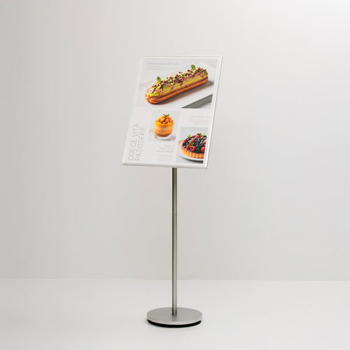 ベースとポールで構成されたスリムなスタンドは、十分な視認性のある高さ。